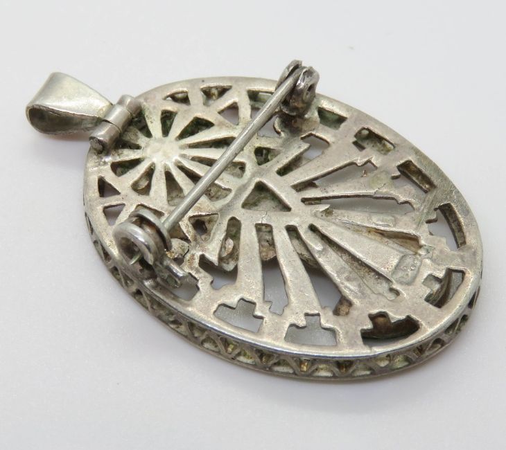 A Mexican silver brooch or pendant in Aztec style with green stone upon.