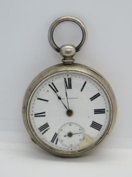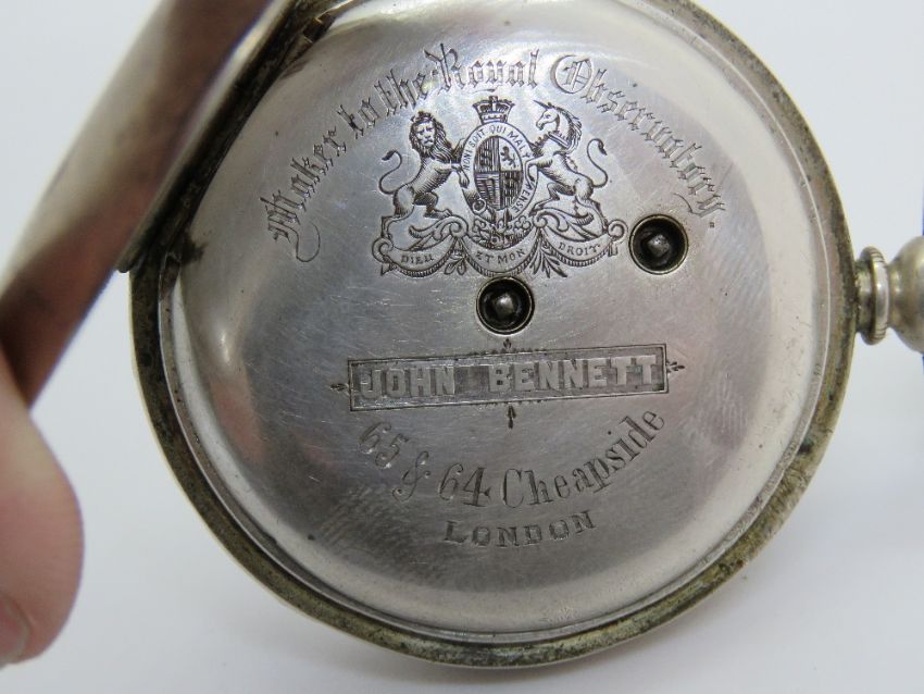 A silver pocket watch by John Bennett Maker to the Royal Observatory 65 & 64 Cheapside London, white enamel dial a/f, blued steel hands. Total weight 112.2g
