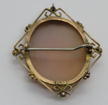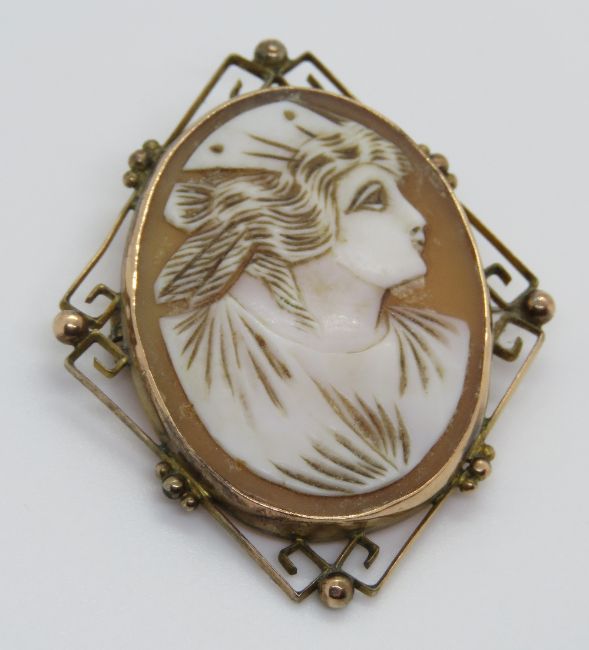 A 9ct gold carved shell cameo brooch, stamped 9ct to Greek key pattern frame, approx 4.6cm high.