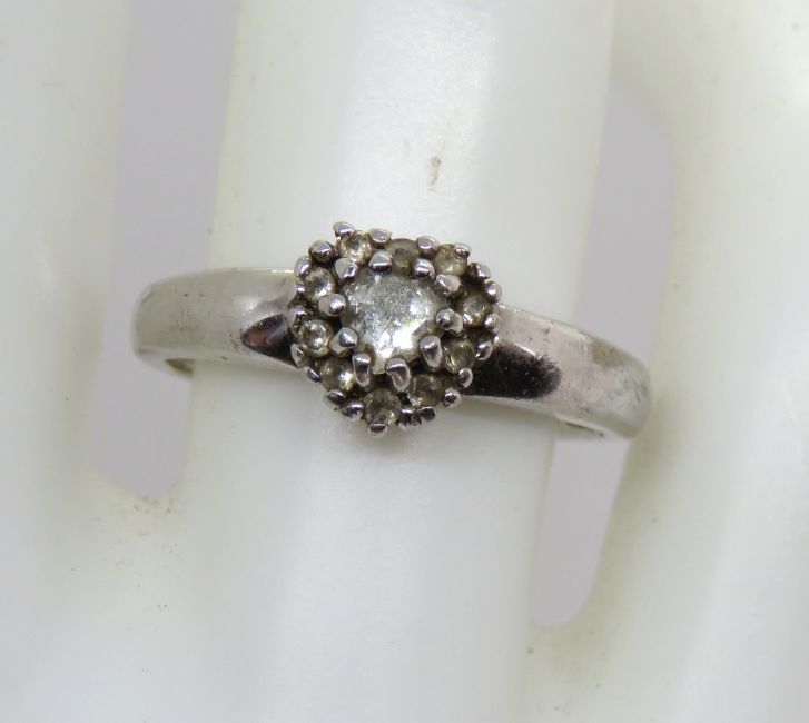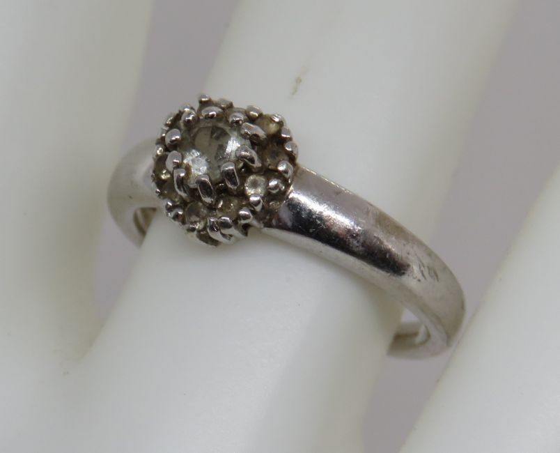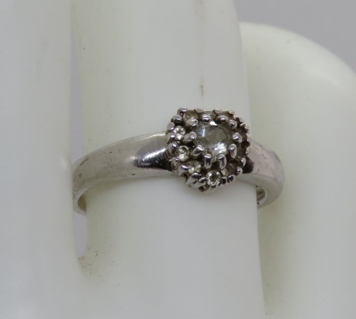 A 9ct white gold ring set with white stones in heart form, size N, 3.1g.
