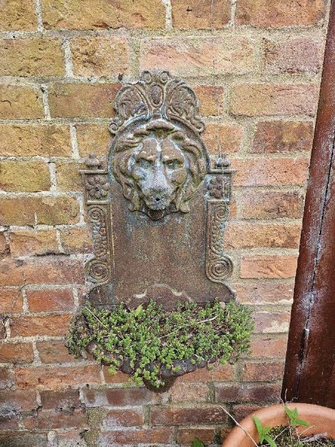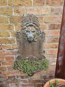 A cast iron lion heads wall fountain, 80 x 40cm.