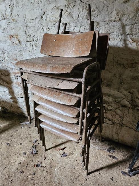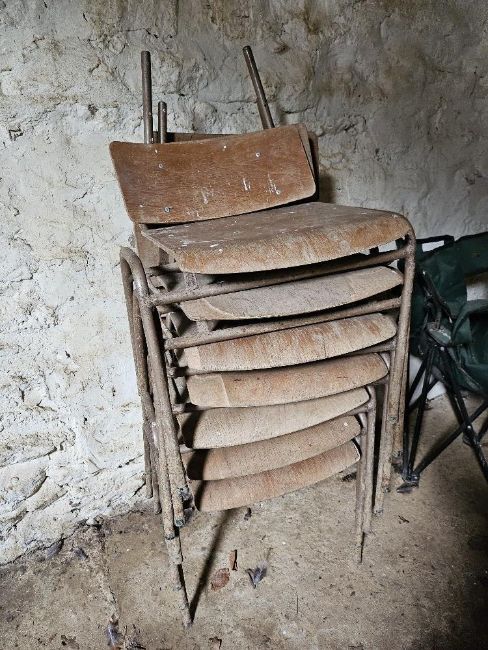 Seven mid century stacking chairs a/f.