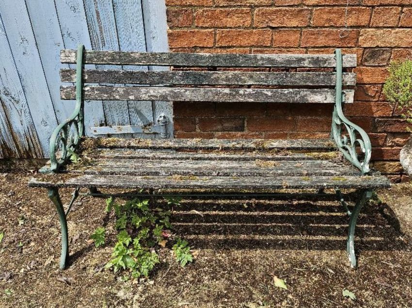 A garden bench having cast iron ends, approx 123cm wide.