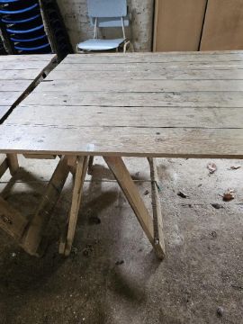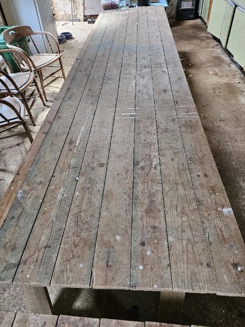 A long pine toped trestle table having three supports, 360 x 86cm.