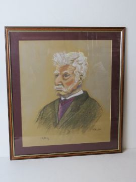 Pastel portrait 'Eric 1995' J N Anley being a white haired gentleman in suit jacket with purple sweater, framed and glazed, overall size 46 x 51cm.