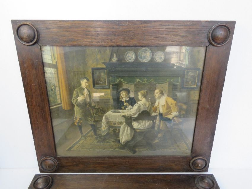 A pair of good oak Arts and Crafts frames having roundel to each corner, one with glass, each containing a print. Sight size approx 49.5 x 39.5cm, overall 64 x 54cm. Reveal size 51 x 41cm.