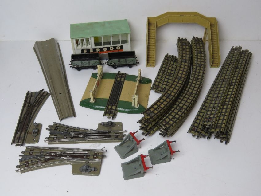 A quantity of Triang and Hornby railway track together with sprung buffers, metal footbridge and metal level crossing.
