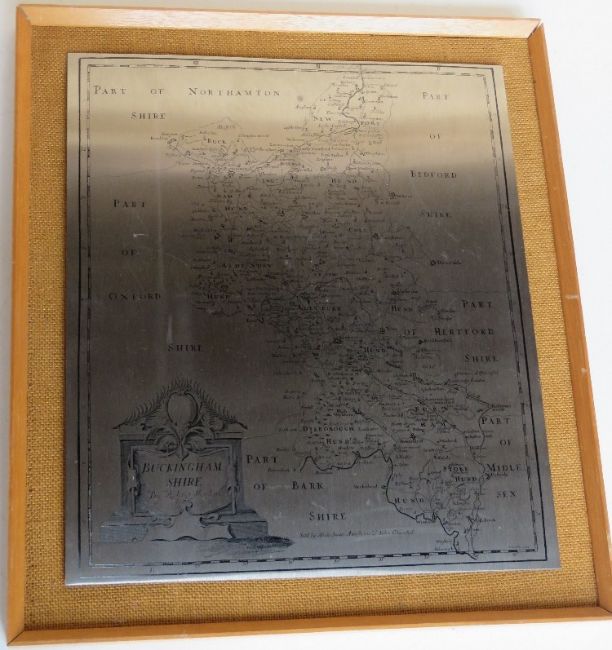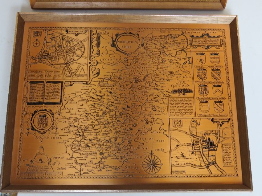 A copper etching from John Speed's Northamptonshire map approx 40 x 32cm overall, together with a stainless steel map from Robert Morden Buckinghamshire, approx 36.5 x 42cm overall.