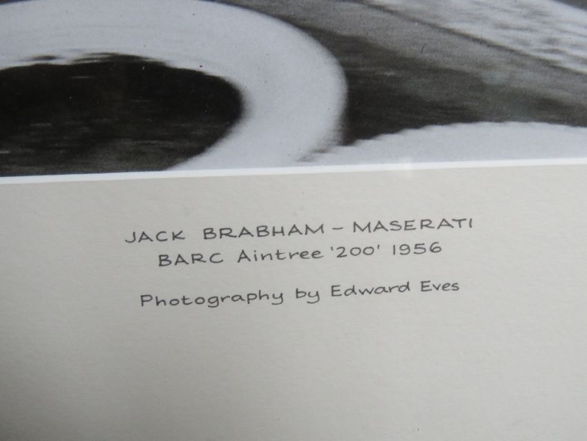 Jack Brabham Autograph, mounted above an Edward Eves photographic print of Jack Brabham in his Maserati BARC - Aintree '200' 1956, framed and mounted 57 x 58.5cm.