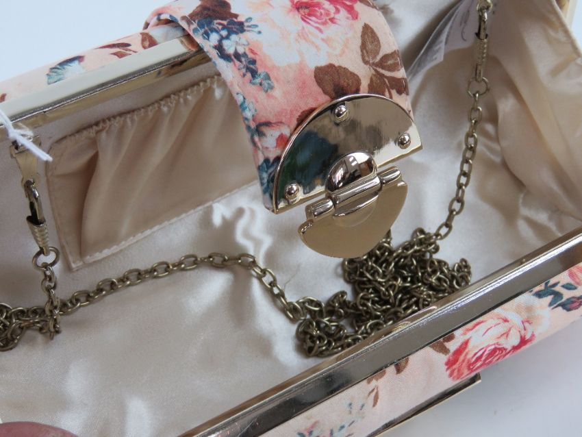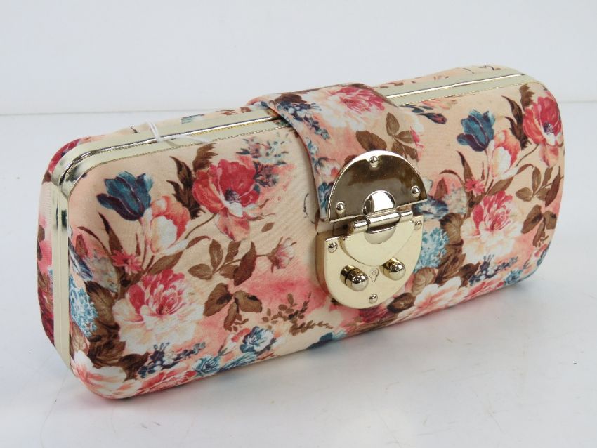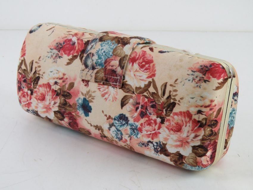 A floral fabric clutch bag, approx 24cm wide.