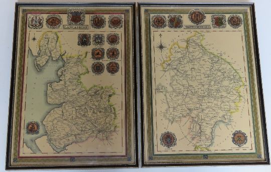 Prints of Lancashire and Warwickshire engraved for Lewis' topographical dictionary, each within matching Hogarth style frames, each measuring approx 29 x 40.5cm overall.