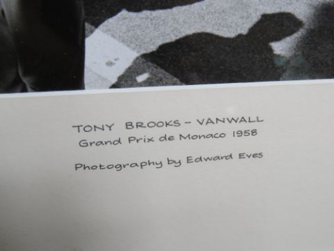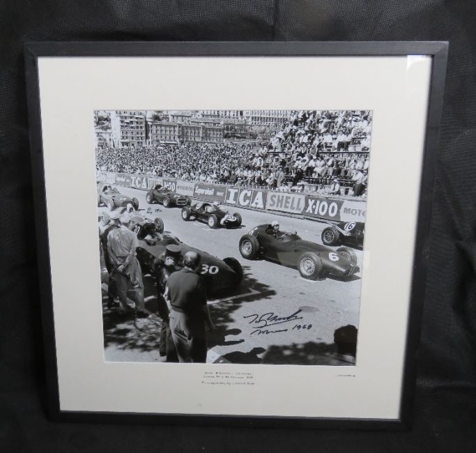 Signed by Tony Brooks; a photographic print of the Monaco Grand Prix 1958, signed by Tony Brooks, framed and mounted, 56.5 x 58cm.