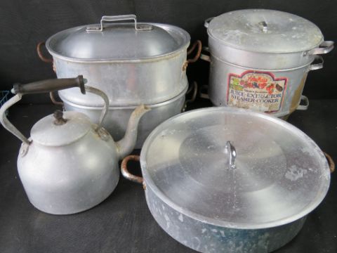 A quantity of steel kitchen pans and a kettle.