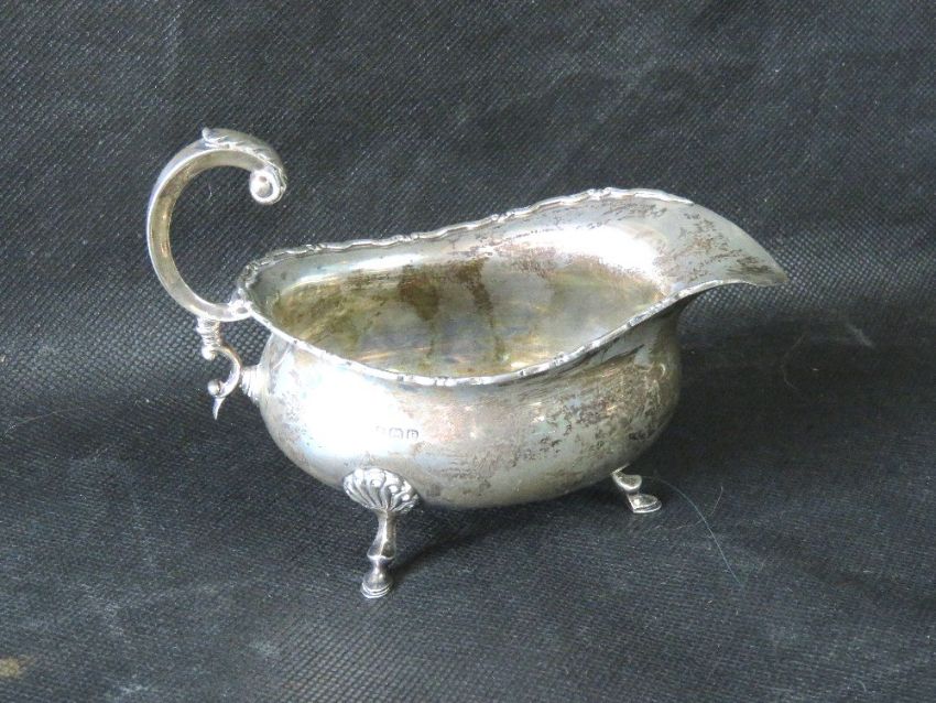 A hallmarked silver sauce boat raised over three feet and standing 10cm high, HM for Birmingham 1928, 145g / 4.69ozt.