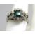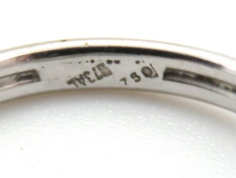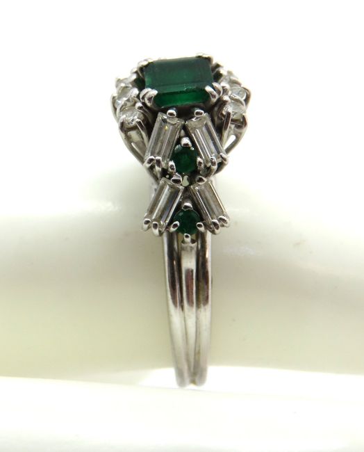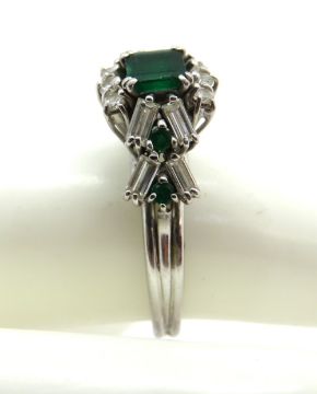 An elegant emerald and diamond cluster ring having central square cut emerald measuring approx 5 x 4.8mm (estimated 0.75ct) having trio of round cut brilliants to top and bottom and further four pairs of baguette cut diamonds to each shoulder in a fan shape around two pairs of round cut emeralds, all set in 18ct white gold, stamped 750, size O, 4.5g.