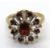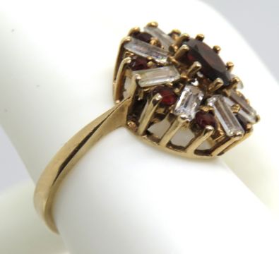A vintage 9ct gold cocktail ring having baguette cut white stones in a starburst cluster around a central oval garnet interspersed with round cut garnets, hallmarked, 4.3g, size P-Q.