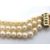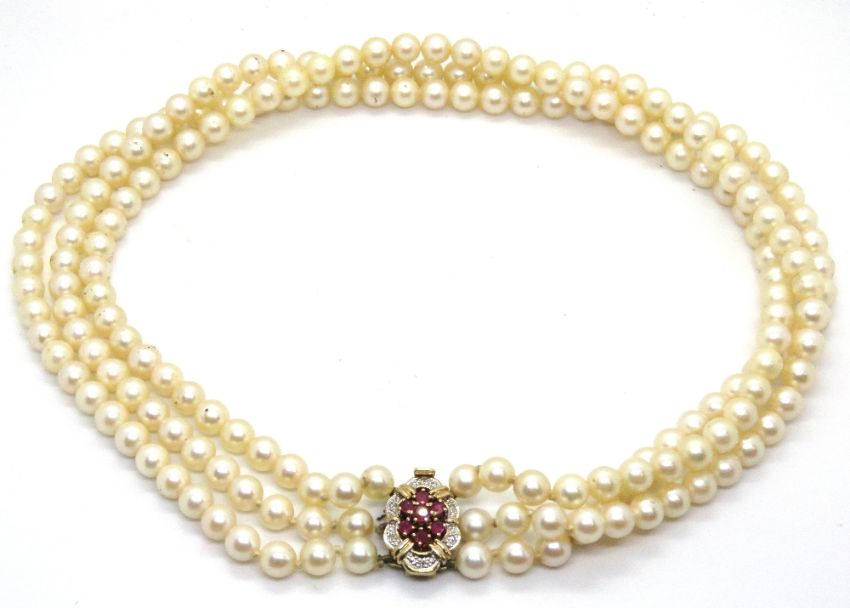 A three strand pearl necklace having 14ct gold clasp set with pink sapphires and diamonds, partial hallmark (worn) and stamped 585, graduated strands 34 - 37.5cm.