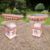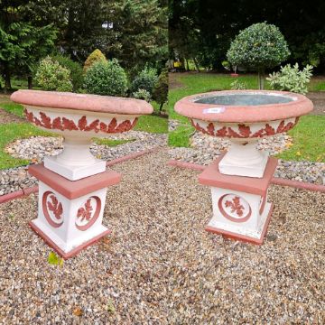 A pair of painted stoneware garden planters raised over square shaped bases, 56cm dia, 66cm high.