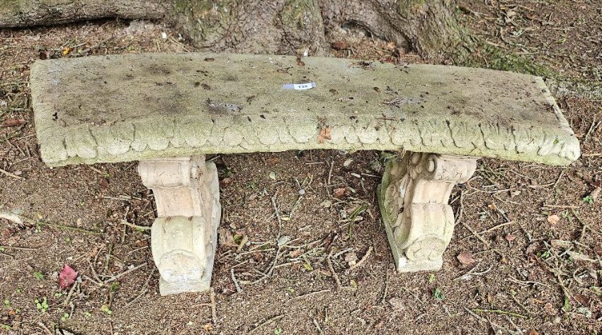 A single curved stoneware garden bench raised over twin decorative supports, 120cm wide.