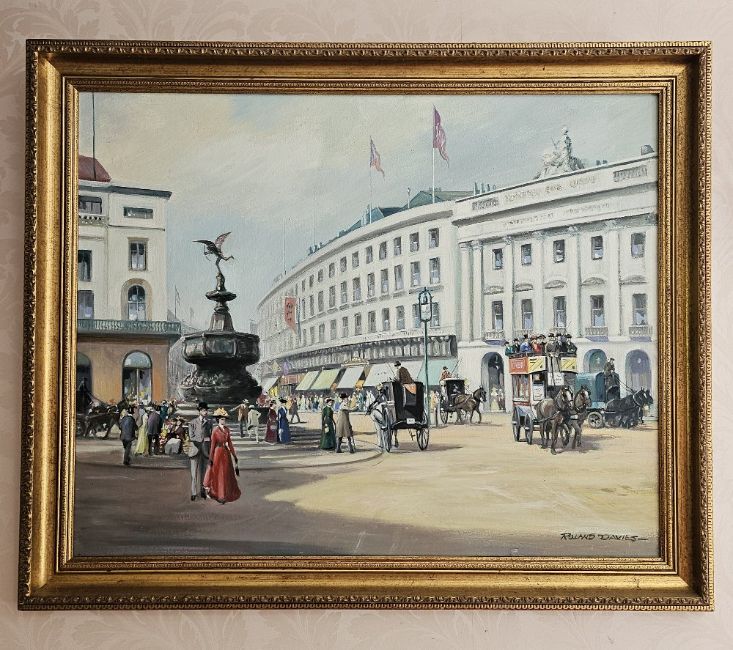 Roland Davies (British 1904-1993), Oil on canvas, signed lower right, Piccadilly Circus and Eros, sight size 75 x 59cm. Gilt frame.