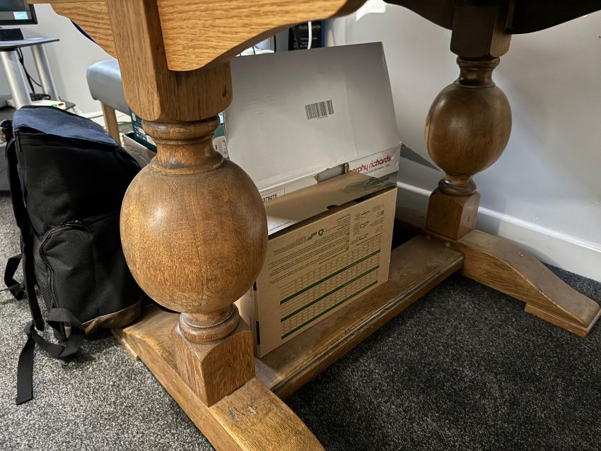 An oak pull out dining table raised over spherical supports.