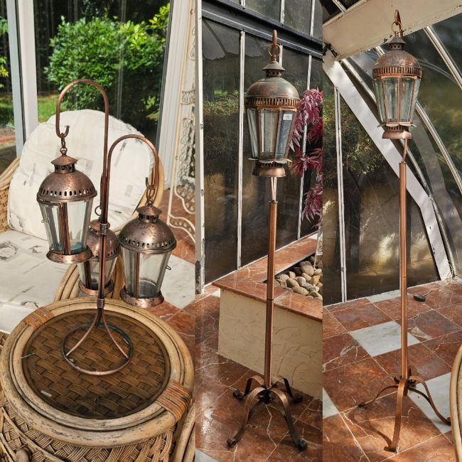 Three copper coloured Indo-Asian hanging lanterns comprising large lamp on stand 202 high, similar 170cm high and 64cm high tabletop lamp.
