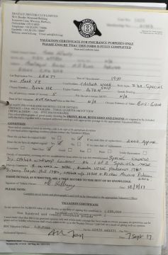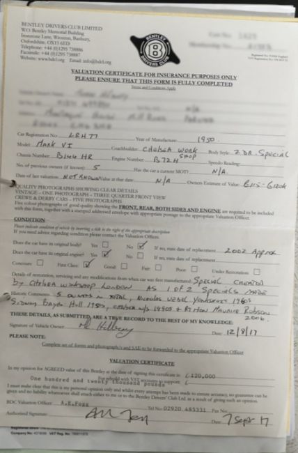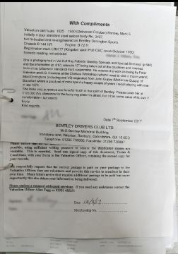 Valuation certificate dated 7th September 2017 from Bentley Owners Club