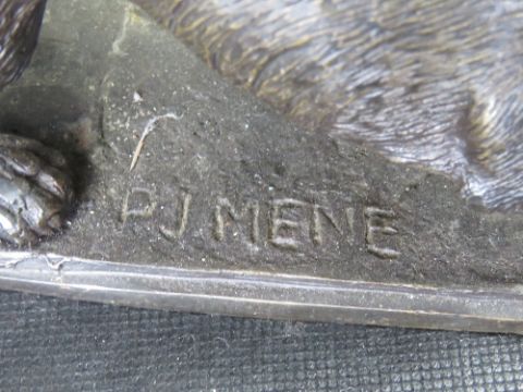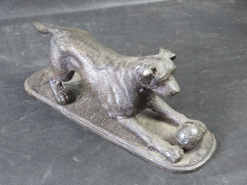 After J.P Mene; bronze figure of playful dog, on naturalistic base, 26cm long.