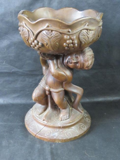 A carved wooded planter stand having cherub lifting a heavy bowl, standing 51cm high.