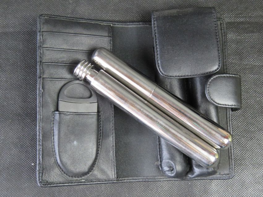 A stainless steel cigar tube and whisky tube set with case and cigar cutter.