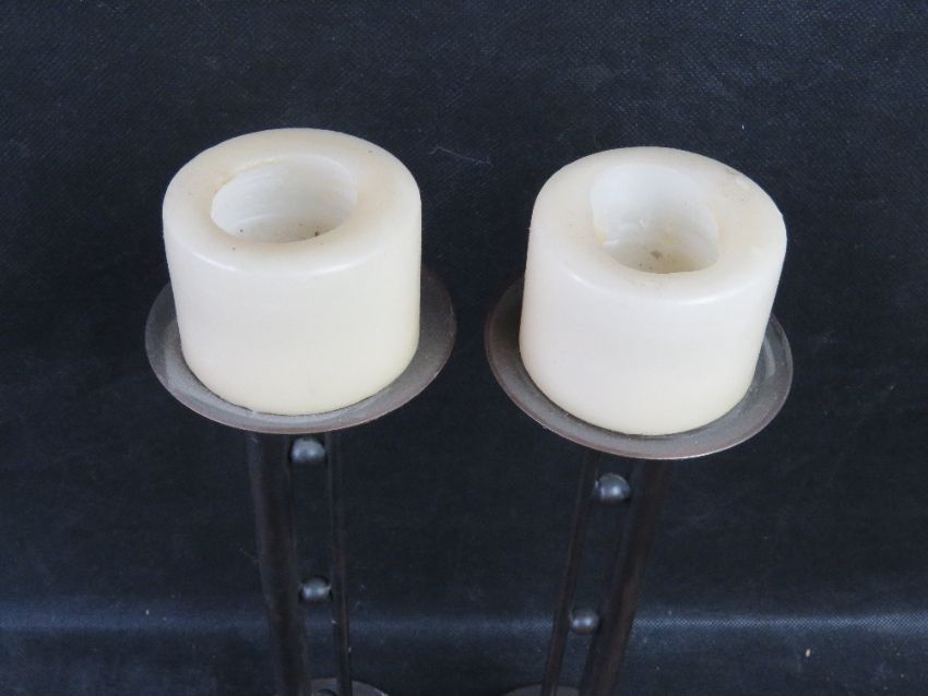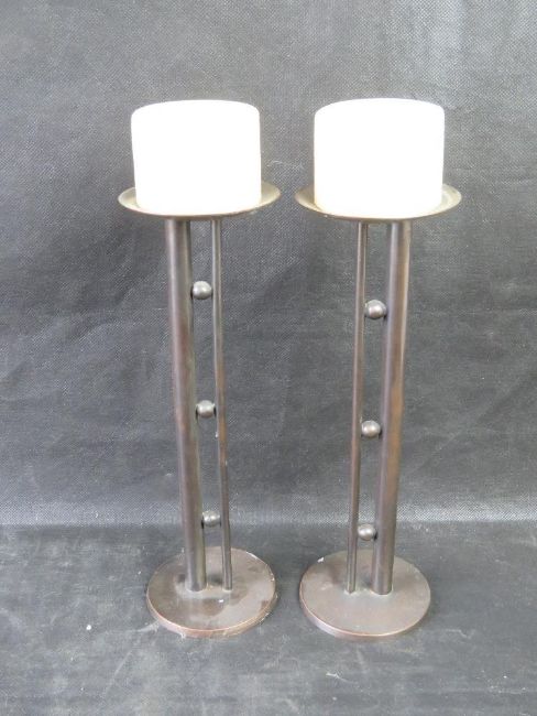 A pair of contemporary candlesticks with candles.