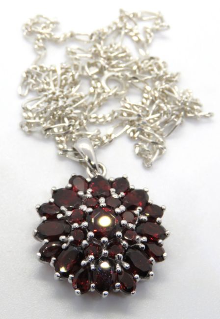 A silver red stone cluster pendant, stamped 925, on silver chain, 32mm inc bale.