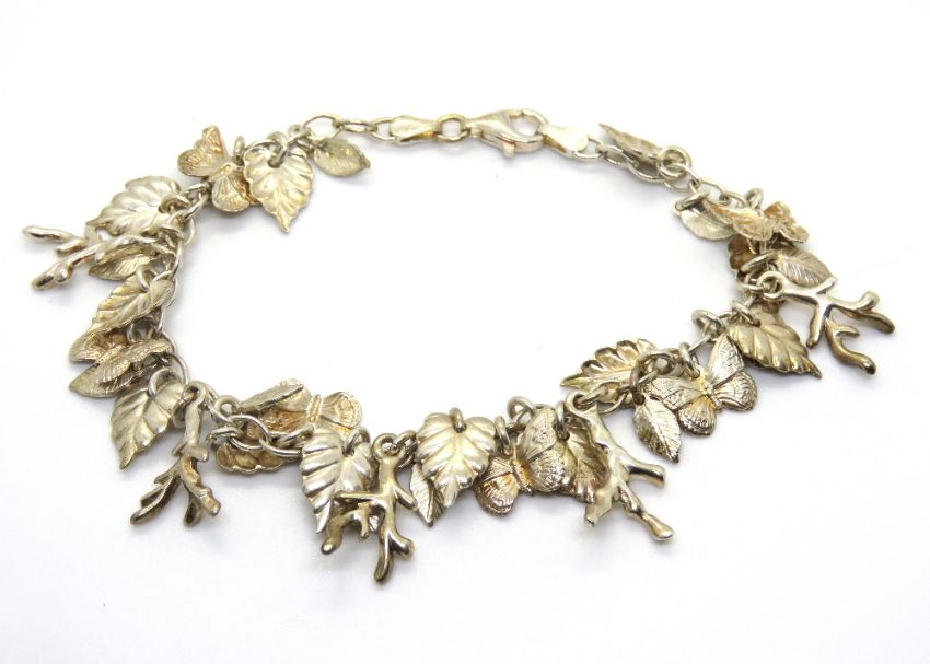 A silver 'charm' bracelet profusely decorated with leaves, butterflies, branches, etc, stamped 925.