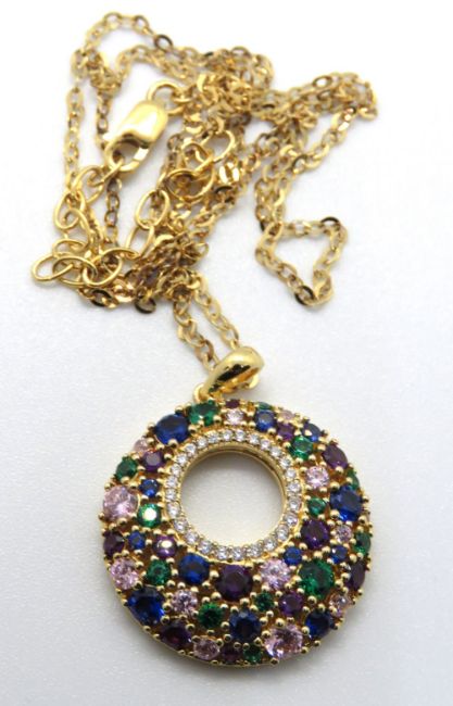 A silver and multi colour stone pendant of round form stamped 925, on silver chain.