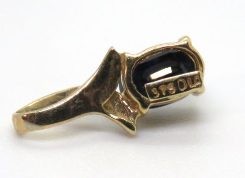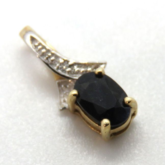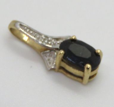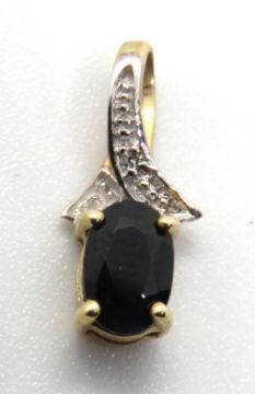 A classic sapphire pendant with ribbon style bale set with diamonds in white metal, stamped 375, 13mm in length, 0.5g.