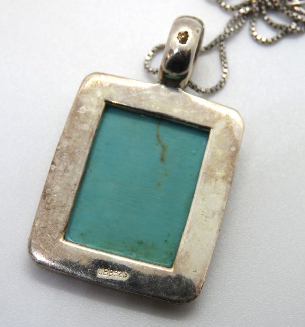 A large silver and turquoise pendant, 38mm in length on silver chain.