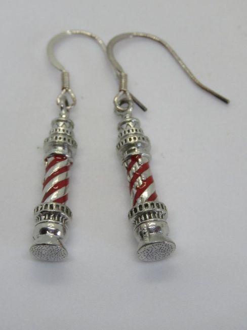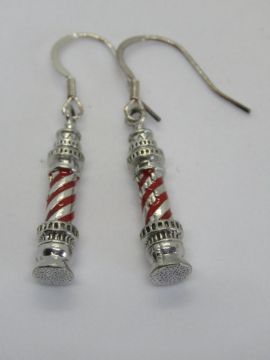 A pair of lighthouse themed earrings, with red enamel design.