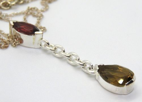 A silver pendant having pear cut stone suspended below red marquise cut stone, stamped 925 and measuring 46mm in length, on silver chain.