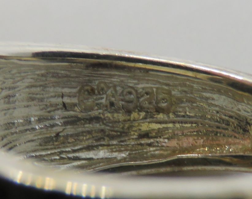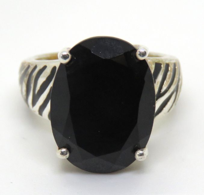 A silver and black onyx ring having enamel tiger stripes to the band, size K/L.