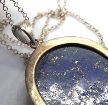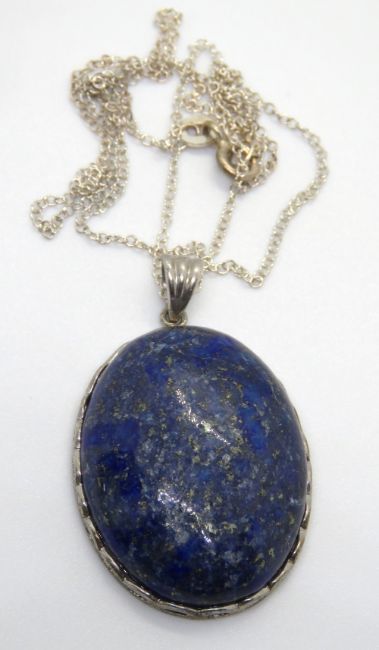 A large silver and lapis lazuli pendant stamped 925, 41mm in length on silver chain..