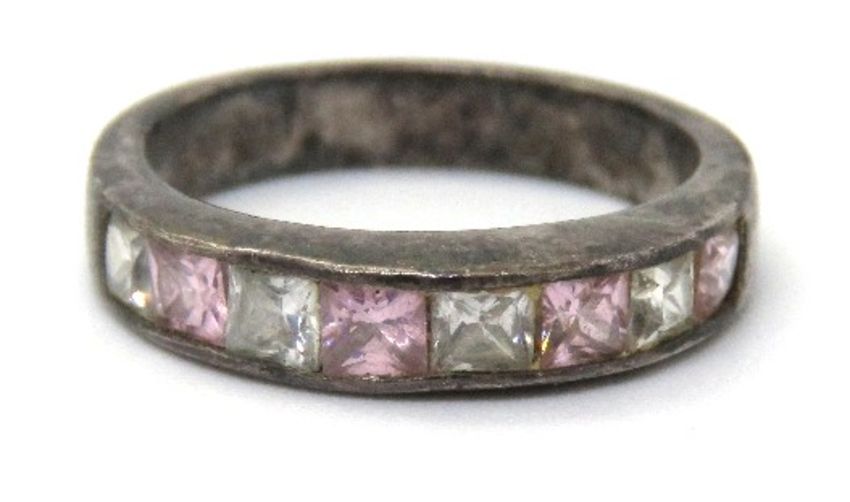 A 925 silver pink and white stone half eternity ring, size M.