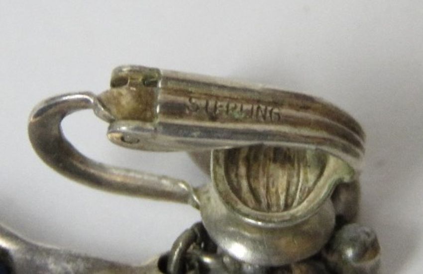A pair of vintage Sterling silver Art Deco earrings having octagonal cut blue stone suspended below a bow, set with marcasite stones.