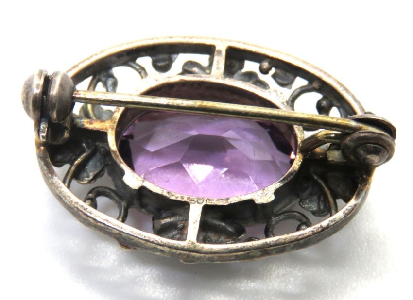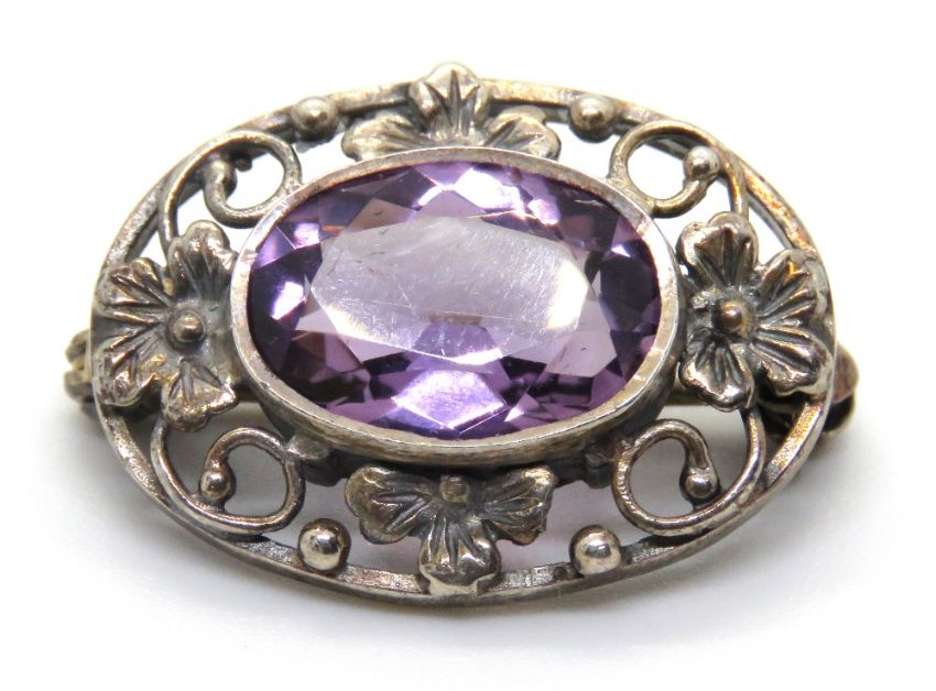 A silver and amethyst brooch, 25mm wide.