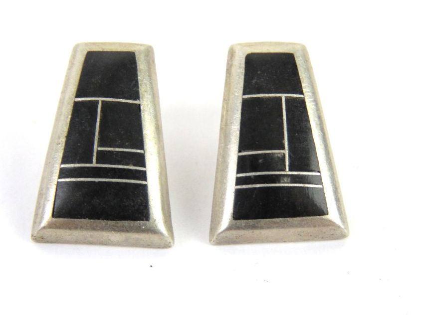 A set of Sterling silver and black onyx Native American jewellery comprising ring size S and earrings each marked Sterling, the earrings also marked for Teme.