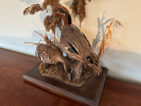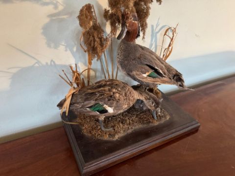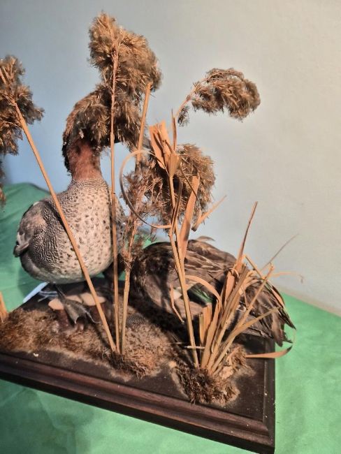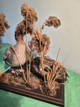 An early 20th century taxidermy mounted pair of Green Teal upon wooden base, 42 x 22 x 27cm.