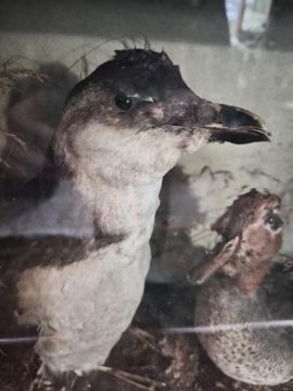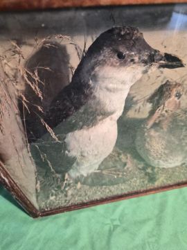 A late 19th / early 20th century taxidermy presentation case containing a juvenile Little Penguin and a Green Teal in naturalistic setting. 48 x 15 x 36cm