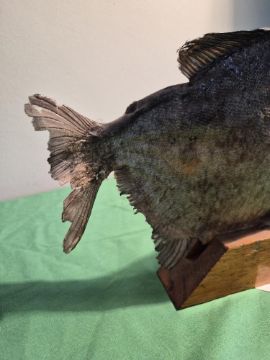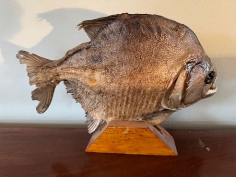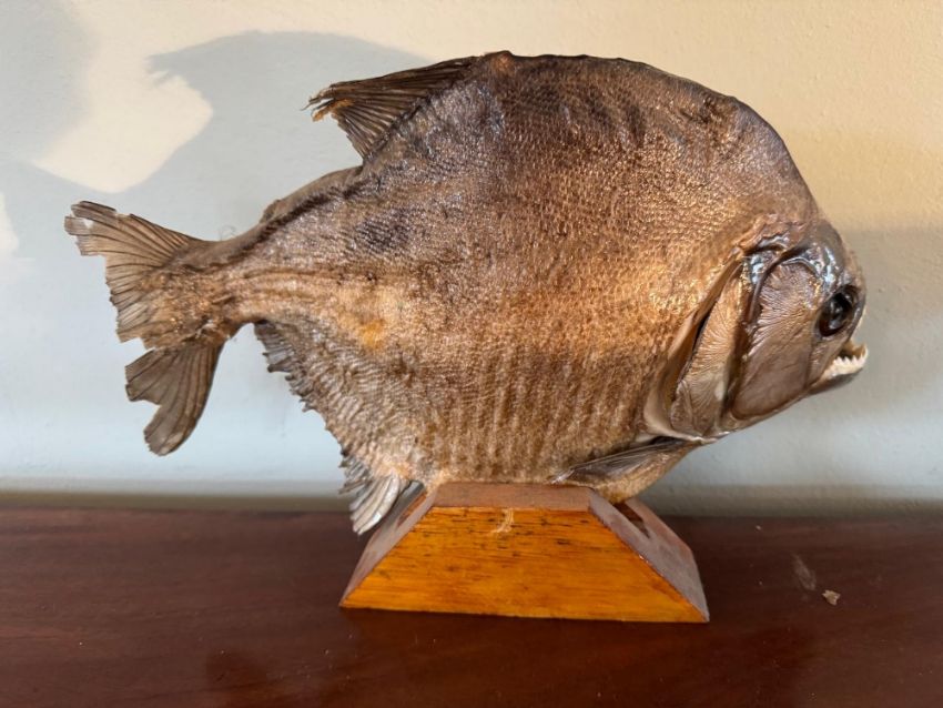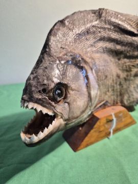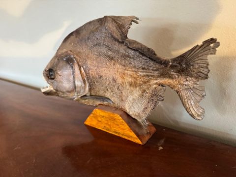 A rare 20th century taxidermy South American Piranah fish approx 32 x 16cm, over wooden base.
