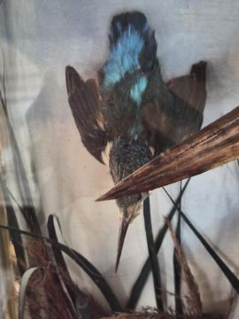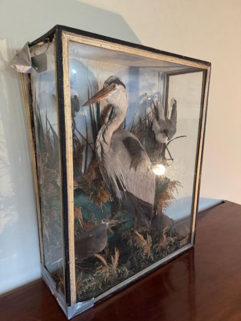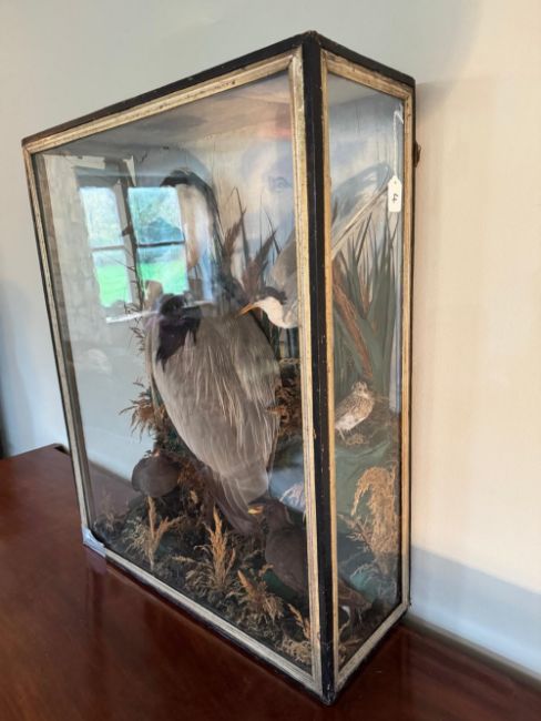 A large early 20th century taxidermy presentation case containing Heron, Kingfisher, Sandlark, Moorhen, juvenile Moorhen and Snipe and a Turn, in naturalistic setting, case a/f. 68 x 26 x 86 cm.