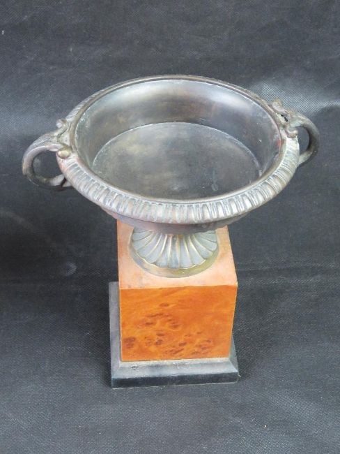 A pair of garniture urns or tazzas after the Grand Tour Mid 19th style, each copper alloy urn stood on burl-patterned base.
