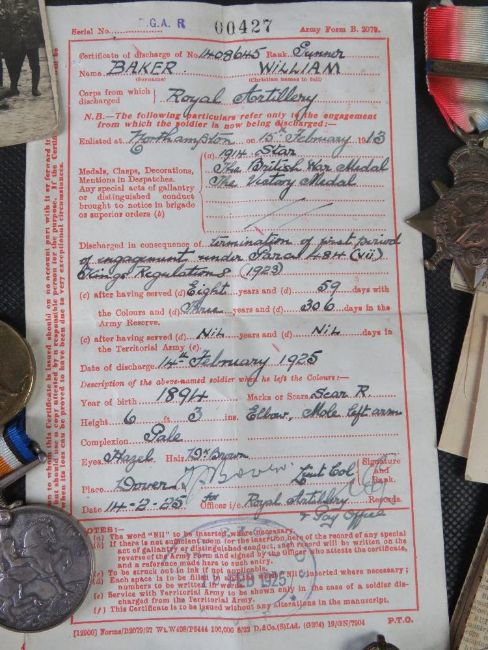 William Baker Royal Artillery WWI War, Peace and 1914 Star medal set and ephemera including discharge note, newspaper clippings and death notice, Christmas tins, badges, Card from Princess Mary, etc.